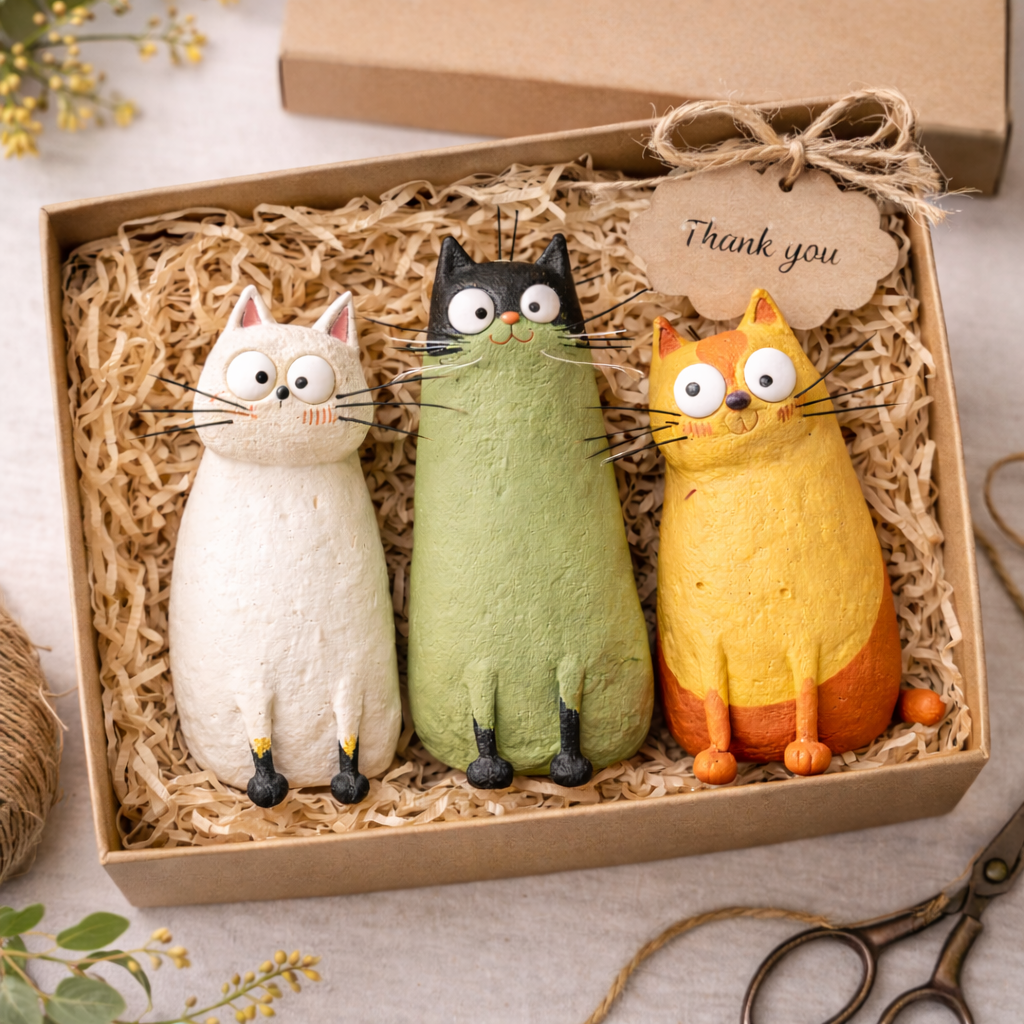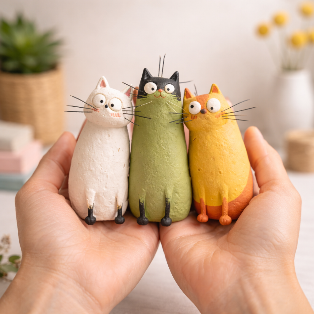 This handmade clay cat figurine set brings warmth, charm, and a playful personality to any space. Each cat is carefully sculpted and hand-painted, giving every piece its own tiny quirks and character that make it truly one of a kind.